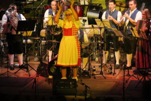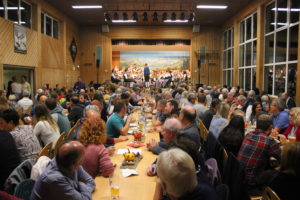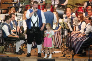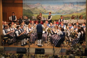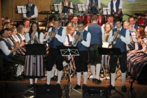 Mit dem Marsch-Gruß an Österreich kehrte die Musikkapelle wieder in großer Besetzung auf die Bühne zurück, dem sie mit dem Gruß an Böhmen einen weiteren Marsch folgen ließ. JJ Jöchle stand beim folgenden Stück, der wunderschönen Alois Polka im Wortsinne im Rampenlicht: Mitten in der Halle spielten er und sein Flügelhornkollege im Scheinwerferspot ihre Soli.