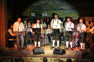 Mit einem Tenorhorn-Solo wurde bei „Ernst im Allgäu“ der Reigen der Solodarbietungen eröffnet. Ein Trompeten Trio zu viert folgte gleich im Anschluss bei „Buglers Holiday“, ebenso wie die meisten Soli von Jungmusikanten dargeboten wurden. Mit einem Gesangs-Duett von JJ Jöchle mit seiner couragierten fünfjährigen Tochter Clara bei der momentan sehr angesagten Polka „Böhmische Liebe“ machte die Musikkapelle Platz auf der Bühne für JuKa-Hüttenband. Bei „Song for you“ , Peter Schad’s Kuschelpolka und „Can you English please“ zeigten die Jungmusikanten, was sie bei ihrem Hüttenaufenthalt mit „intensiver Probenarbeit“ (O-Ton Magnus Räth) gelernt hatten. Kommentar einer Besucherin: „Dia Junge kennat’s!“